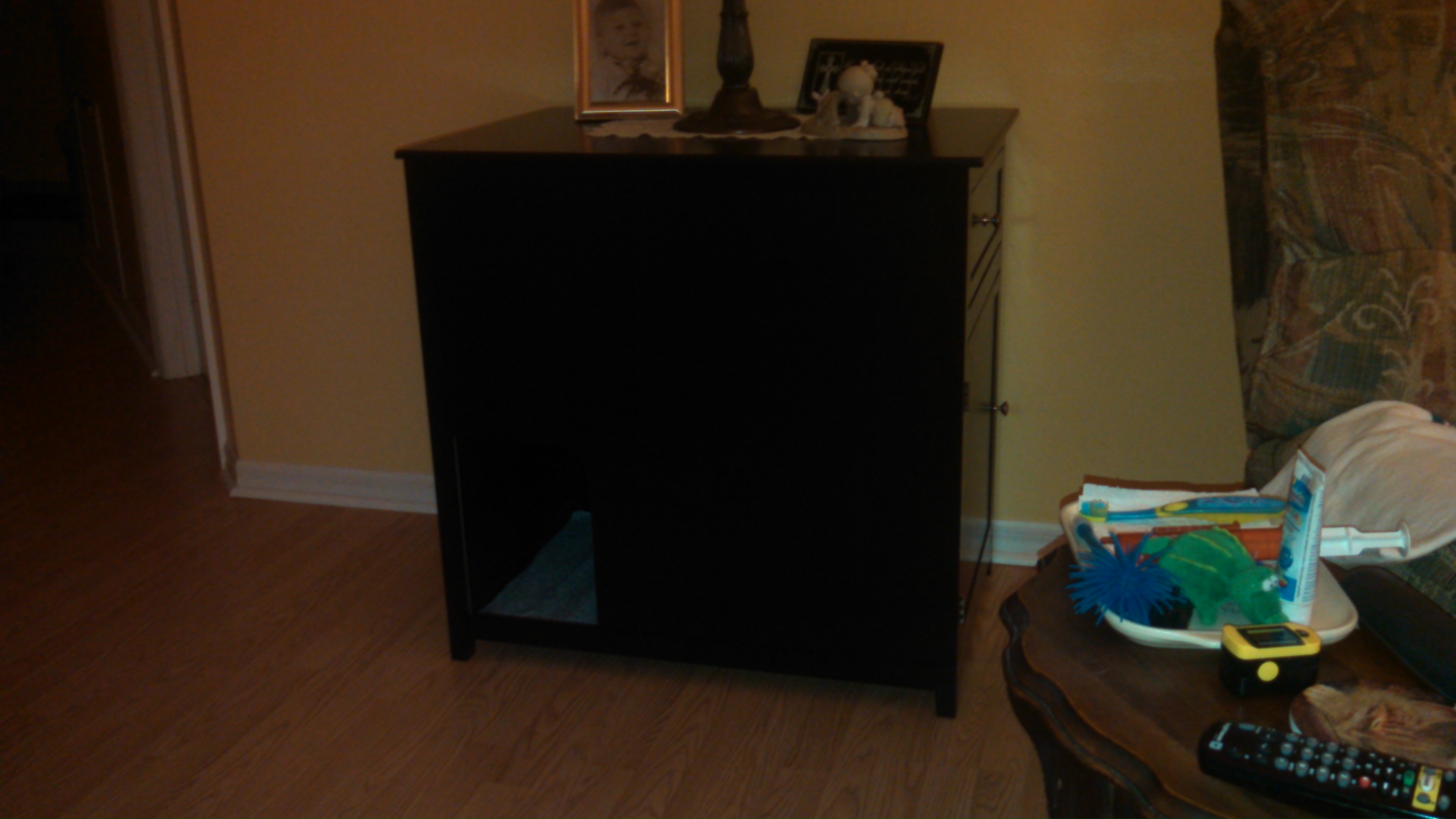 Finally, we decided on what looks like an end table or cabinet with a cut out for the cats to get in and out of. It’s called a Pet Privacy Den, and we can open the door and put the food inside.