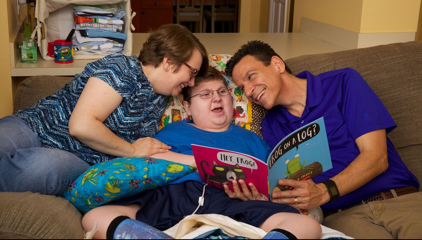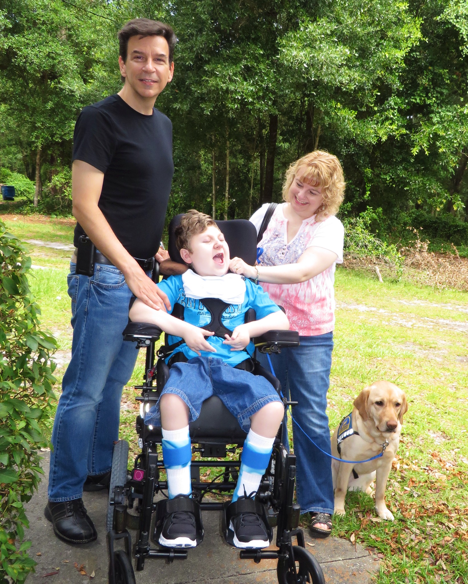 J.P. is totally reliant on us for all of his daily needs. He uses a wheelchair, has a g-tube for feeding and a vagal nerve stimulator to control his seizures. He doesn’t speak in words, but makes sounds and is fully aware of everything going on around him.